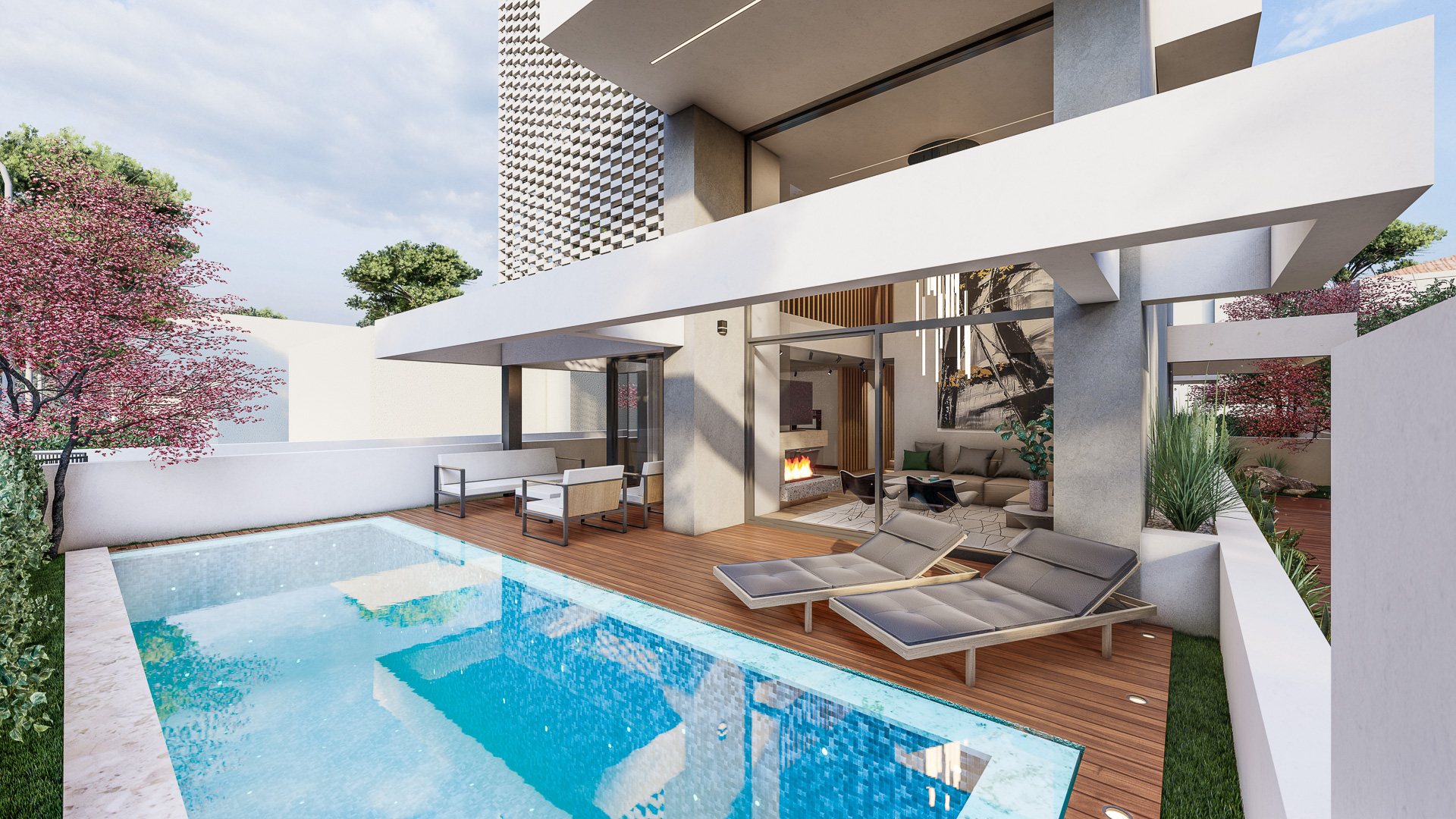 The luxurious ground & first floor maisonette offers all the comforts of a modern residence. It is characterized by aesthetics that combine luxury with practicality. Our primary concern was the stylish and elegant use of materials such as wood and glass to create mild color contrasts not only with the natural environment that inspired the architectural project but also with the surrounding area, namely the private swimming pool and the ground floor garden, of which the maisonette retains exclusive use. The property includes an additional two parking spaces in the basement and a storage room.