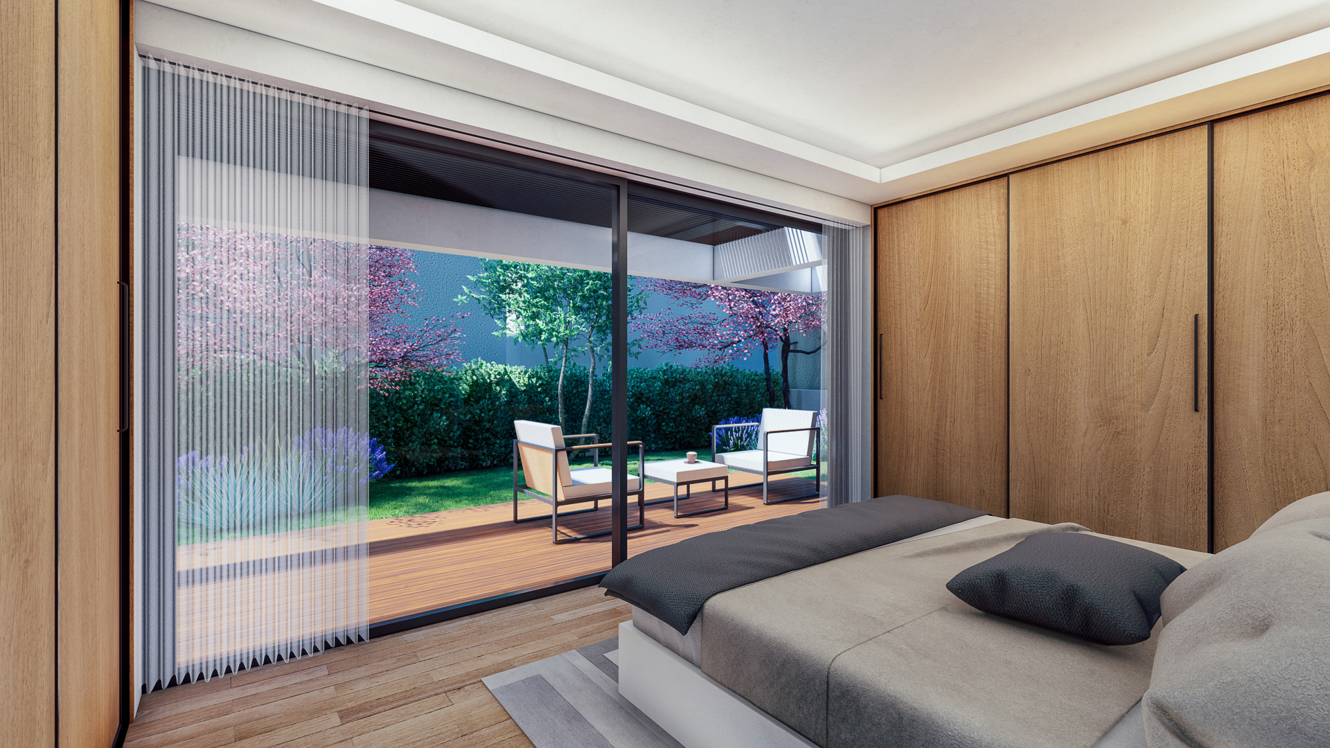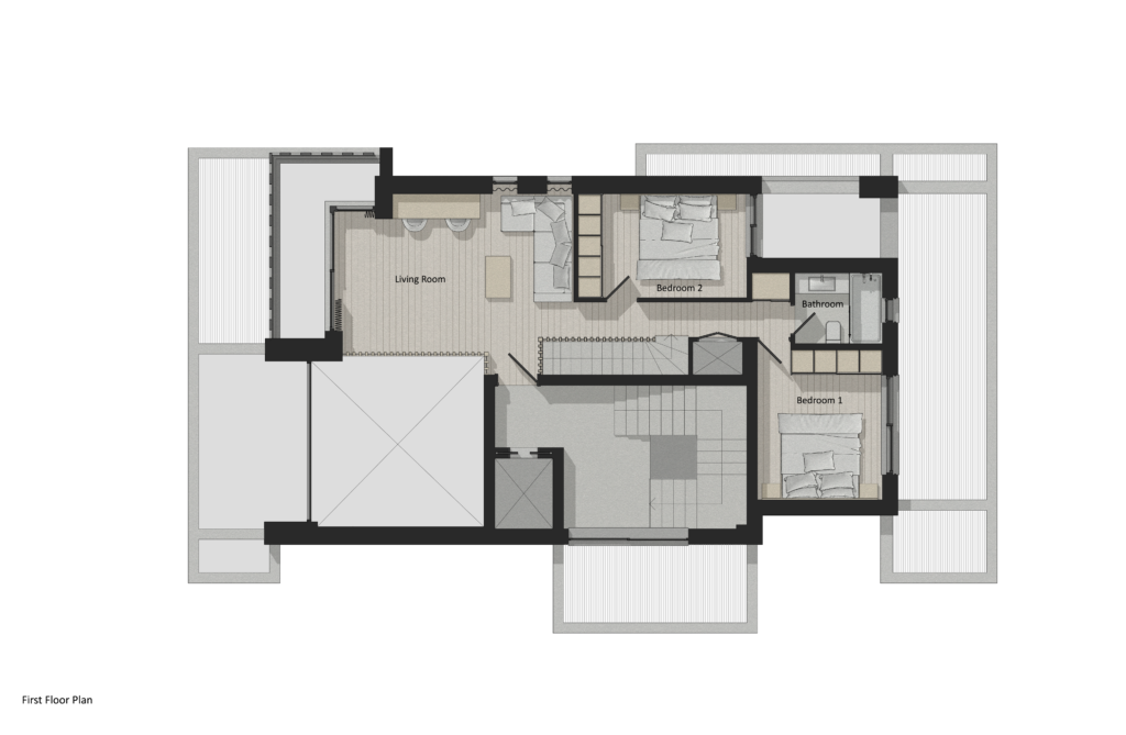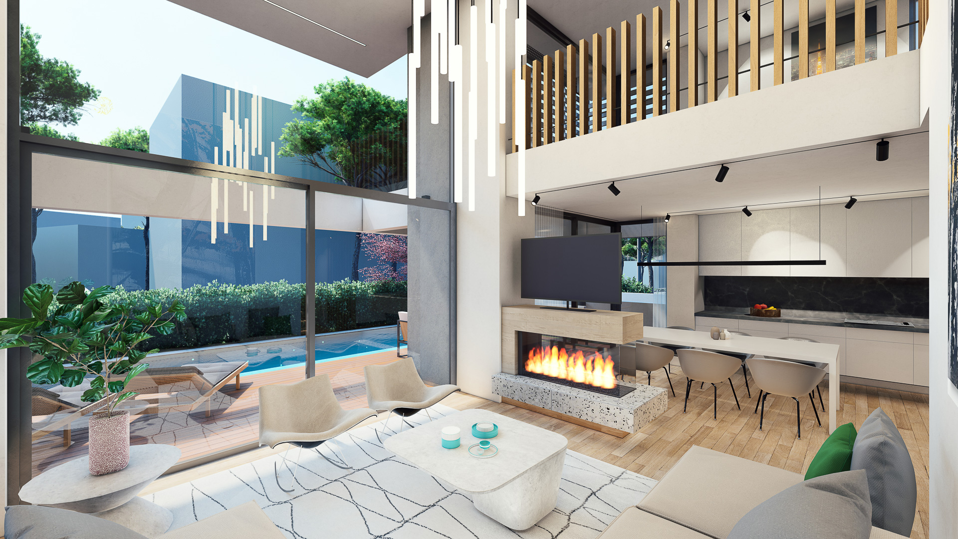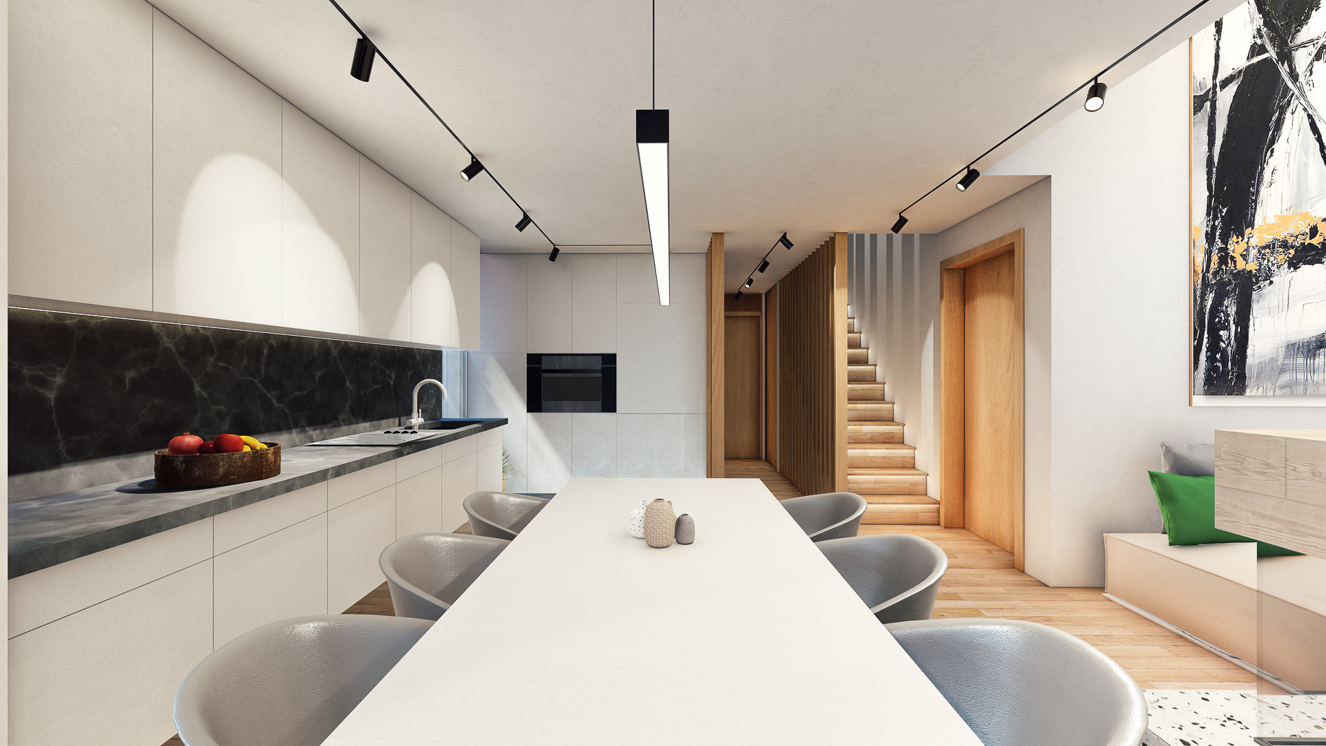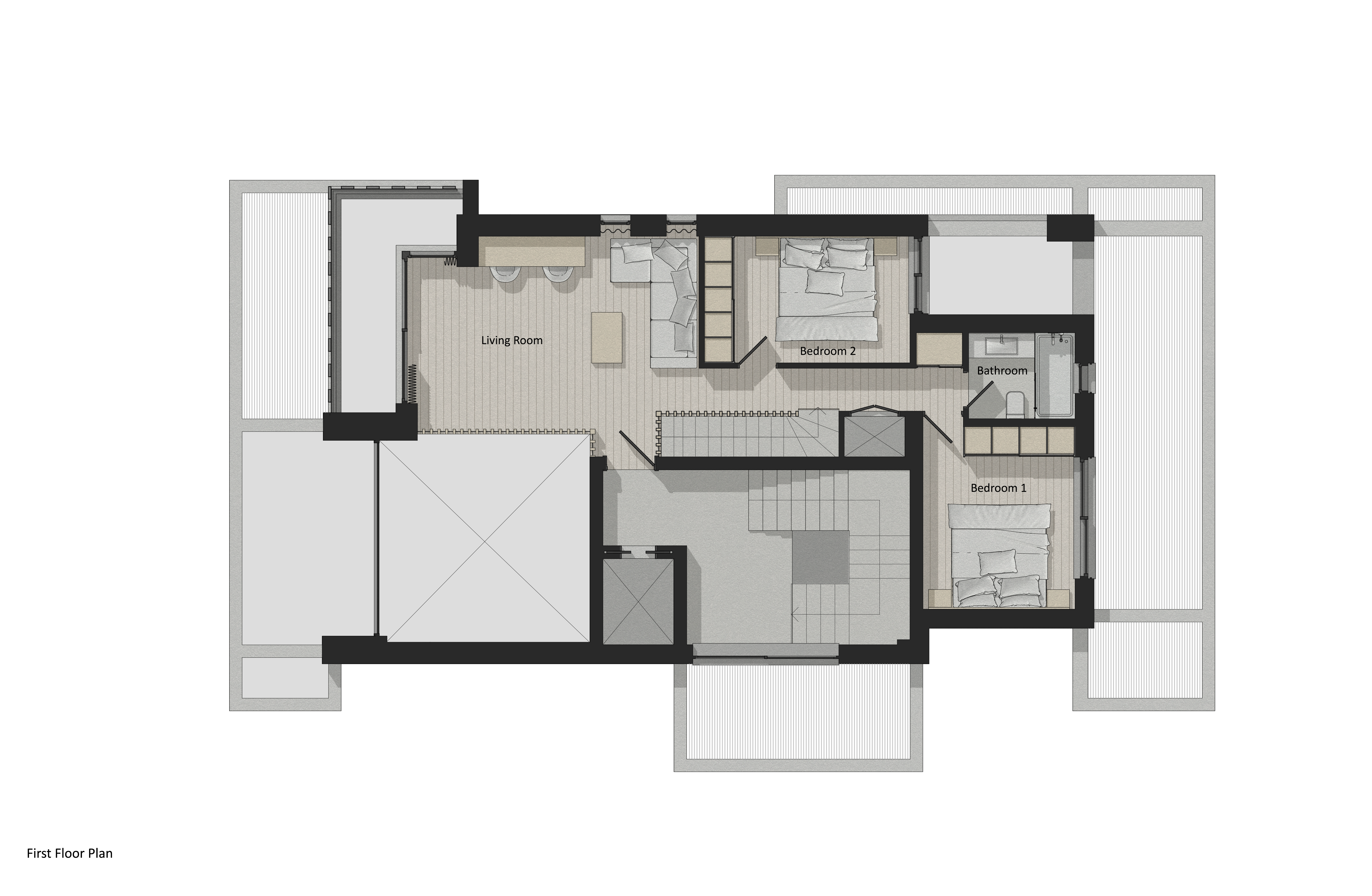 The ground floor level consists of common areas, a large master room, a guest bathroom with dressing room and the staircase to the upper level. The first-floor level includes 2 additional bedrooms with bathroom and a living room offering visual contact with the living room on the ground floor so that the house can be perceived by the residents as a single, indivisible whole. This design philosophy also infuses the connection between the maisonette and the surrounding area. For this reason, care has been taken to ensure unobstructed visual contact with the garden, the pool and the natural environment embracing the house from multiple angles.