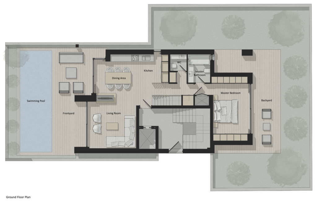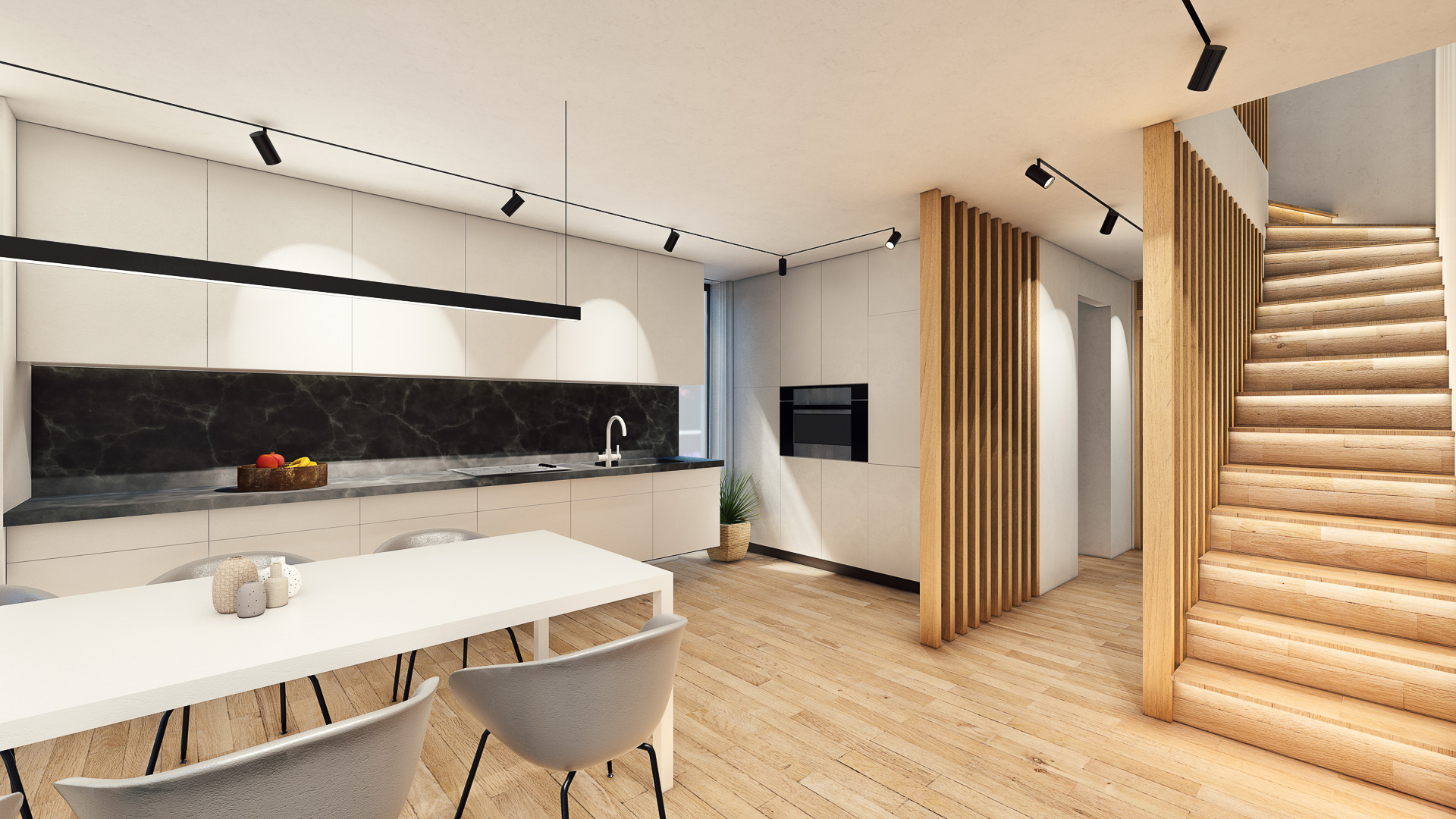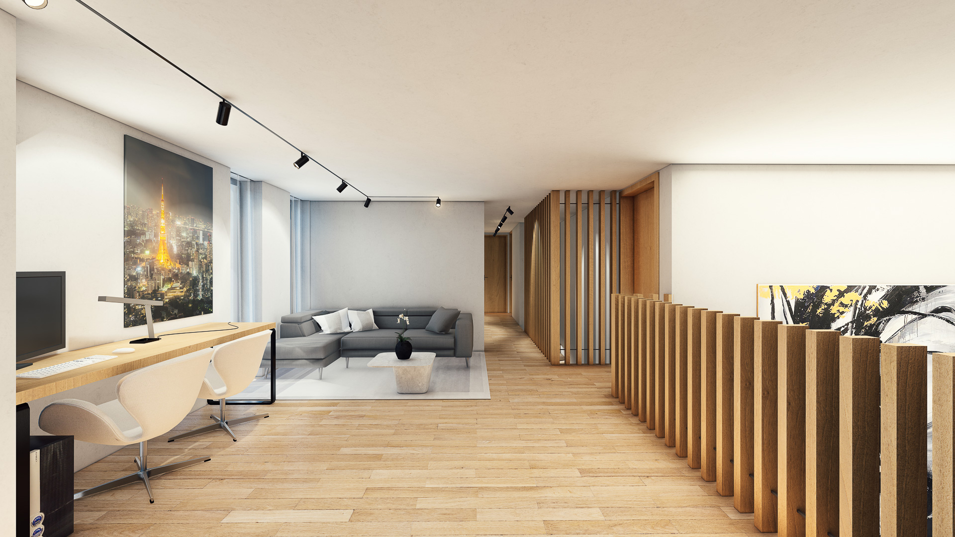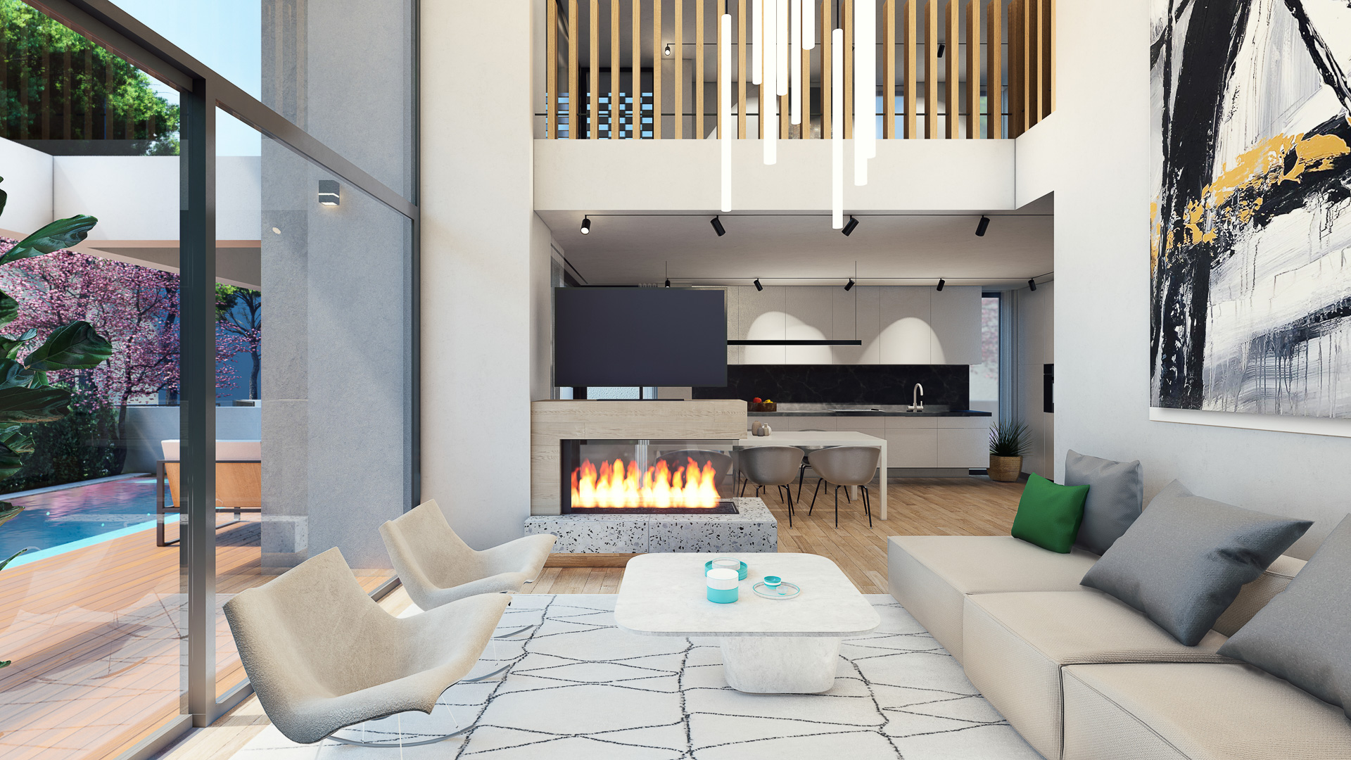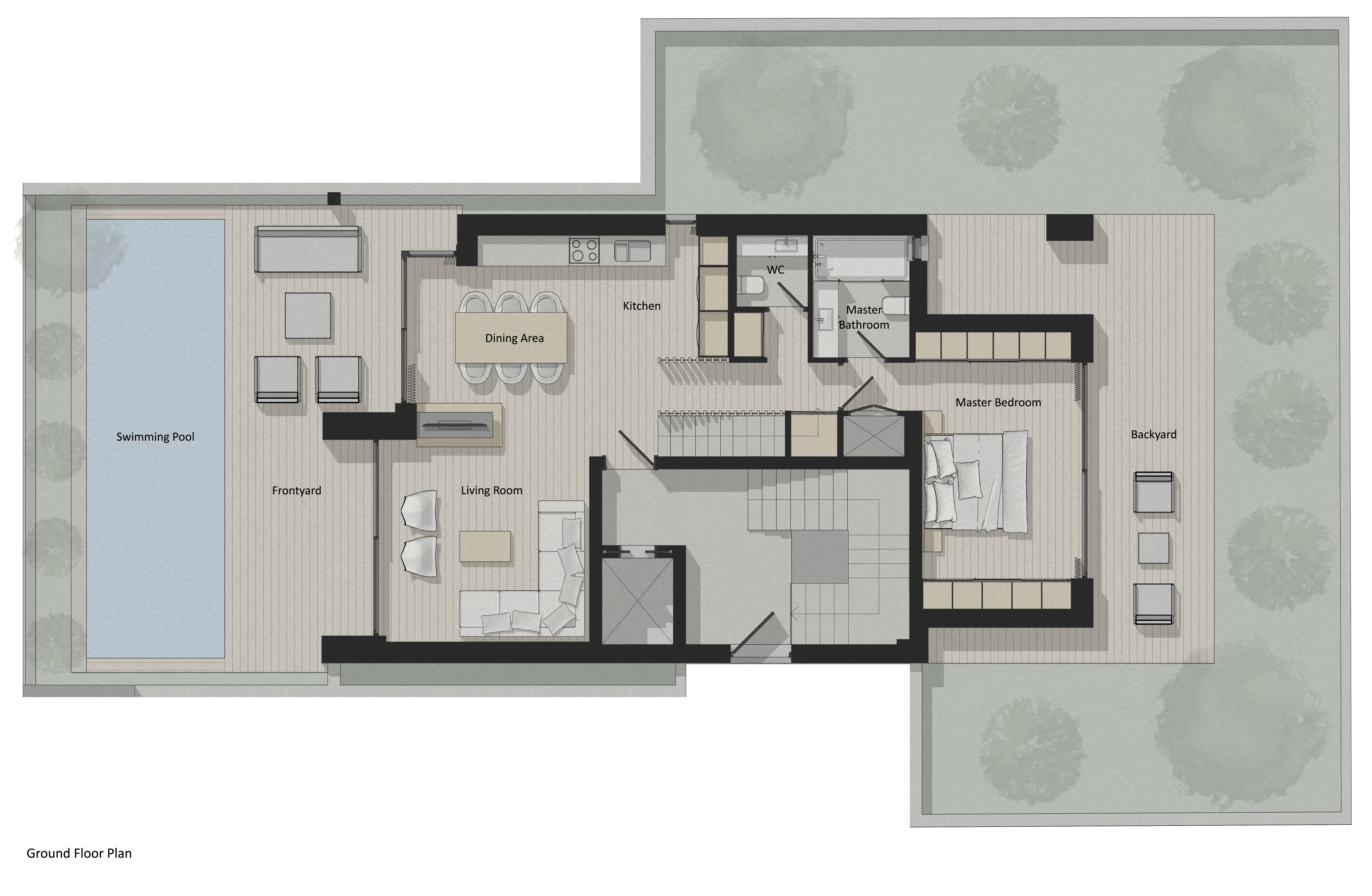 The ground floor level consists of common areas, a large master room, a guest bathroom with dressing room and the staircase to the upper level. The first-floor level includes 2 additional bedrooms with bathroom and a living room offering visual contact with the living room on the ground floor so that the house can be perceived by the residents as a single, indivisible whole. This design philosophy also infuses the connection between the maisonette and the surrounding area. For this reason, care has been taken to ensure unobstructed visual contact with the garden, the pool and the natural environment embracing the house from multiple angles.