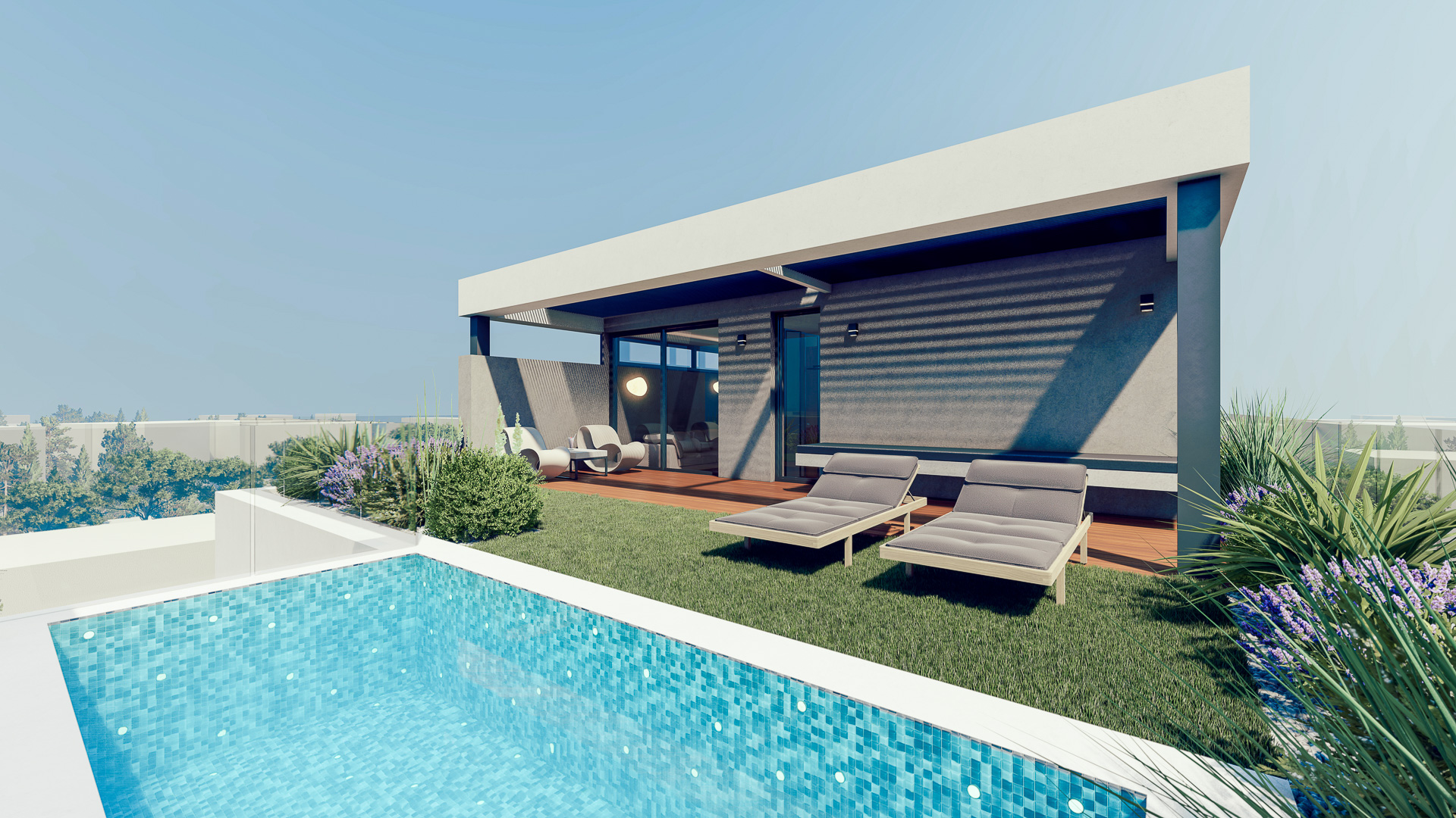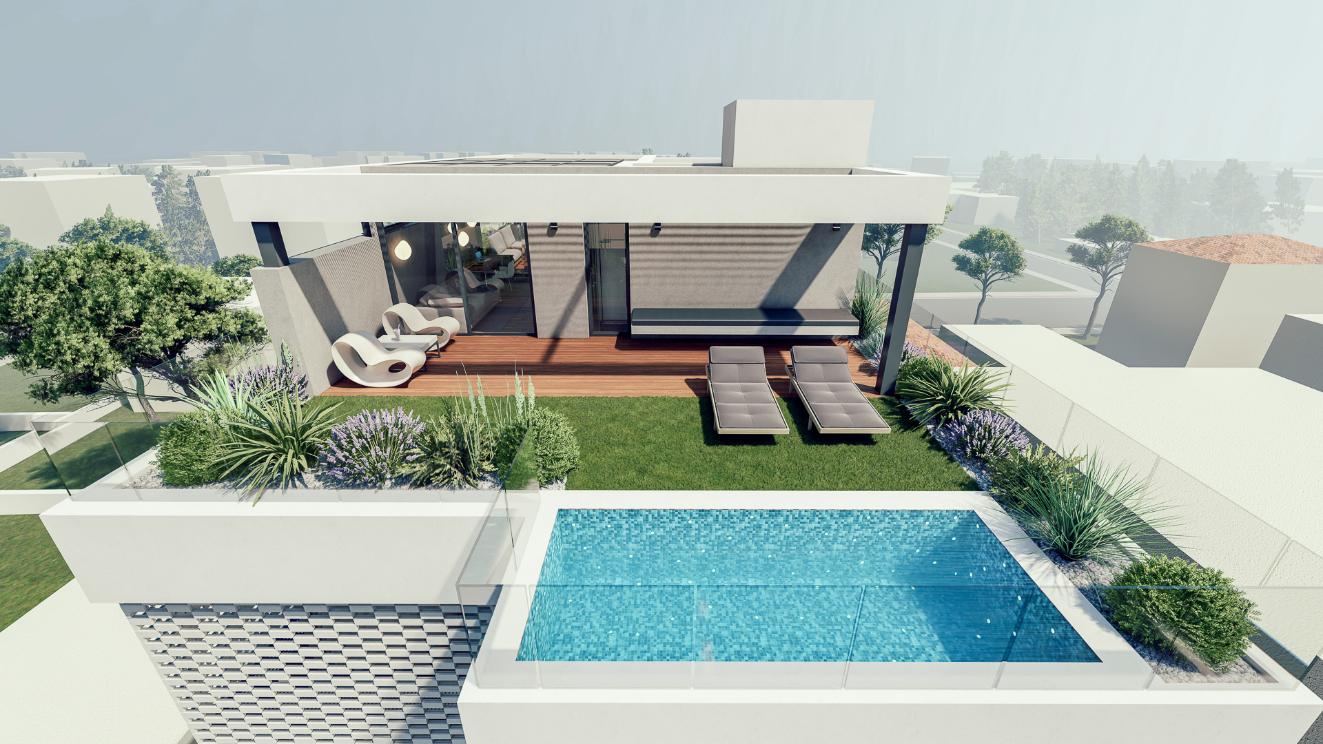 The fourth & fifth floor maisonette is a modern two-storey residence with unobstructed view to the sea. Its signature element is the garden on the fifthfloor level where the swimming pool is also located. The view of the clear blue Attica sky, of the greenery surrounding the property and of the sea through the open private garden is the culminating point of the design vision that inspired the construction of the building. The residence merges with the natural environment and the residents acquire full access to nature, which aesthetically defines the construction of the maisonette.