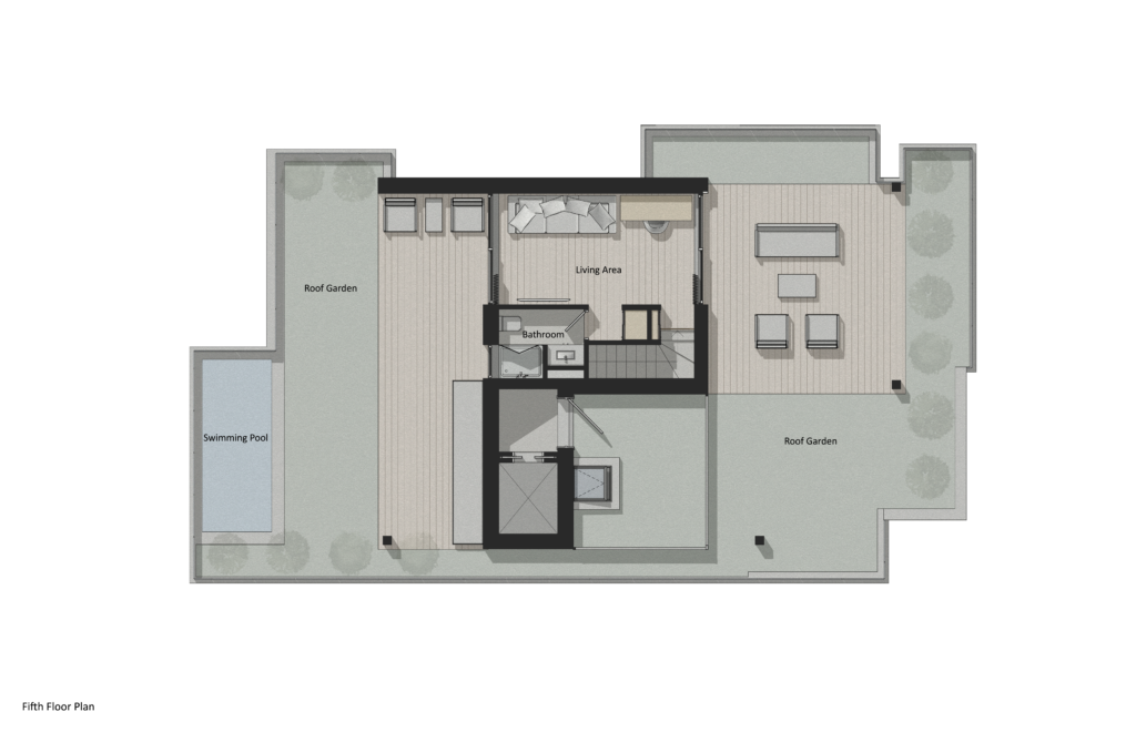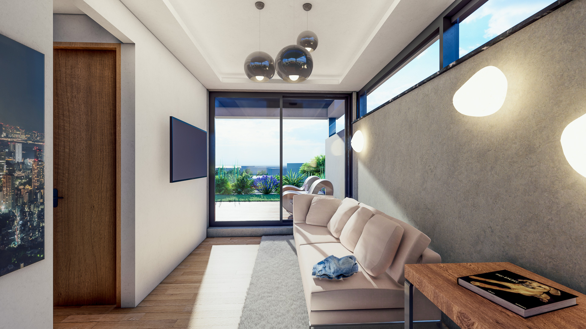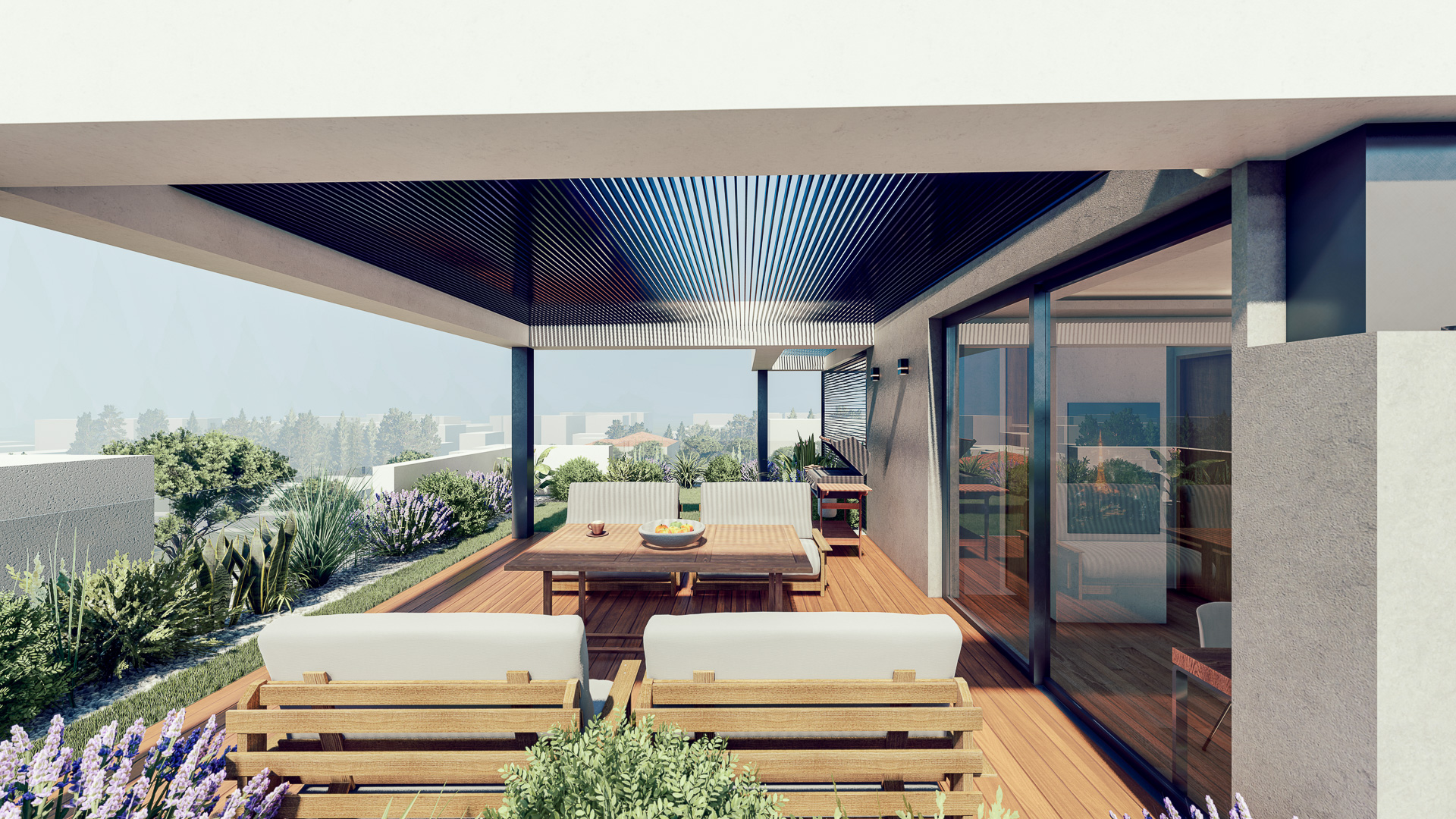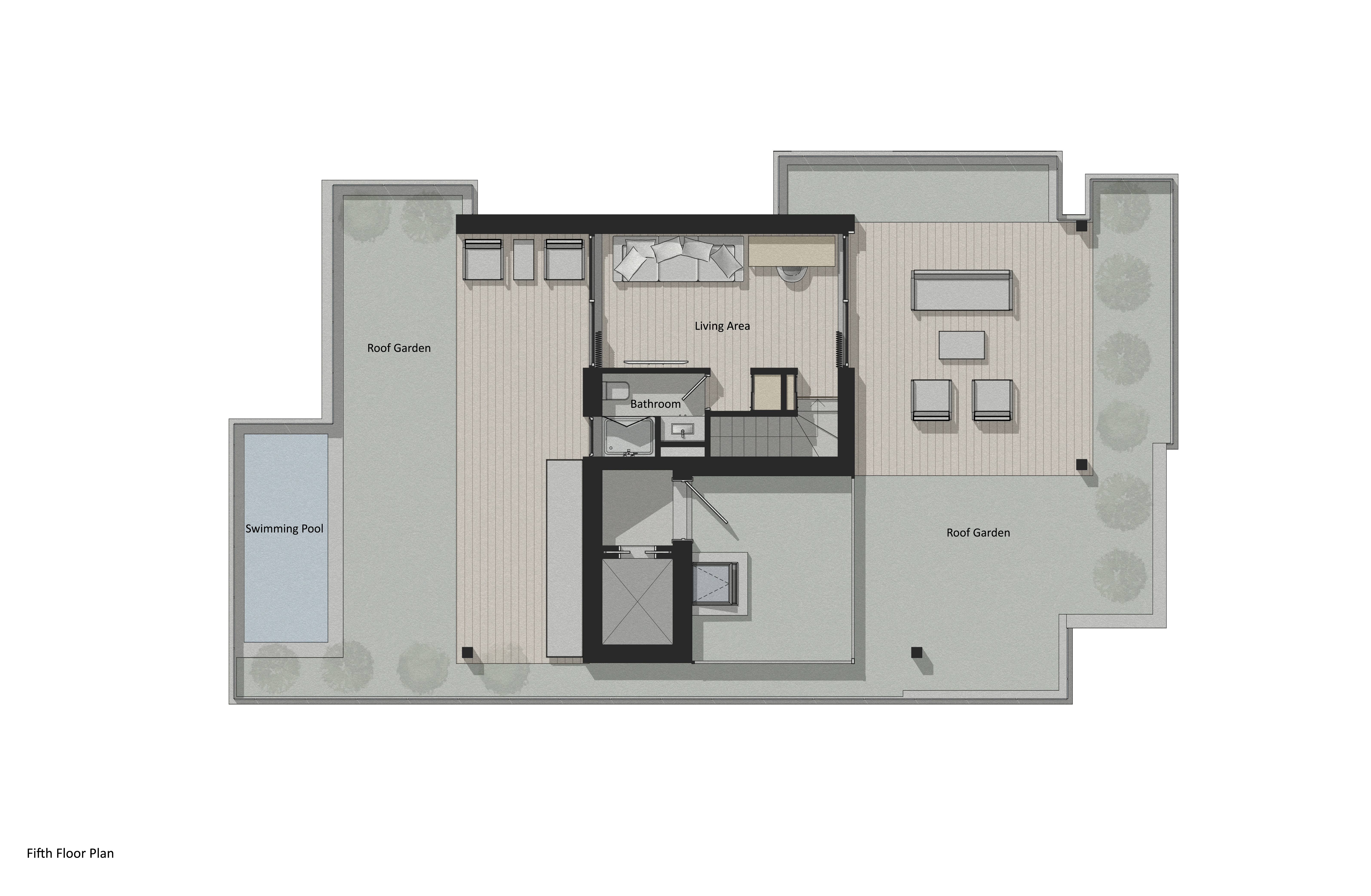 For this effect to be achieved, all the common areas on the fourthfloor level are placed on the side facing the street ensuring sea view. The residence includes a large master bedroom, two additional bedrooms with bathroom, while on the fifth-floor level there is an additional room, with bathroom & guest dressing room, providing access to the garden on the top floor.