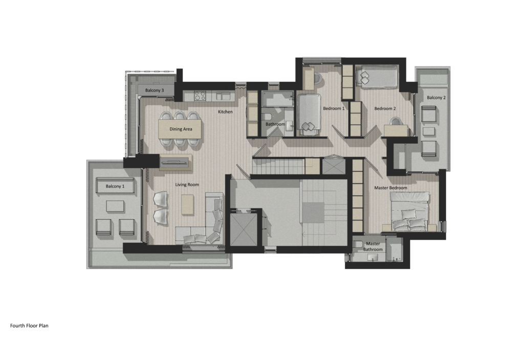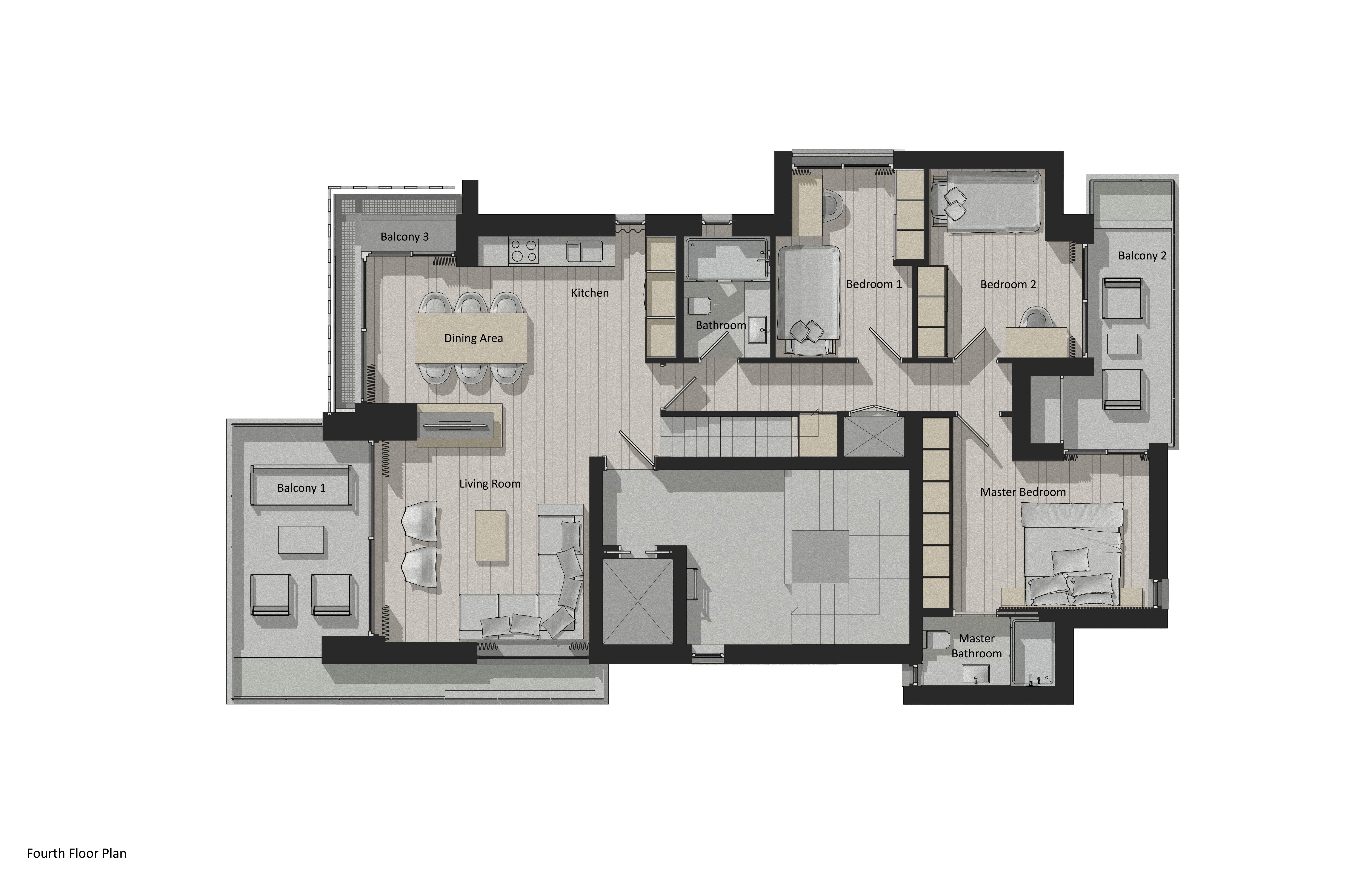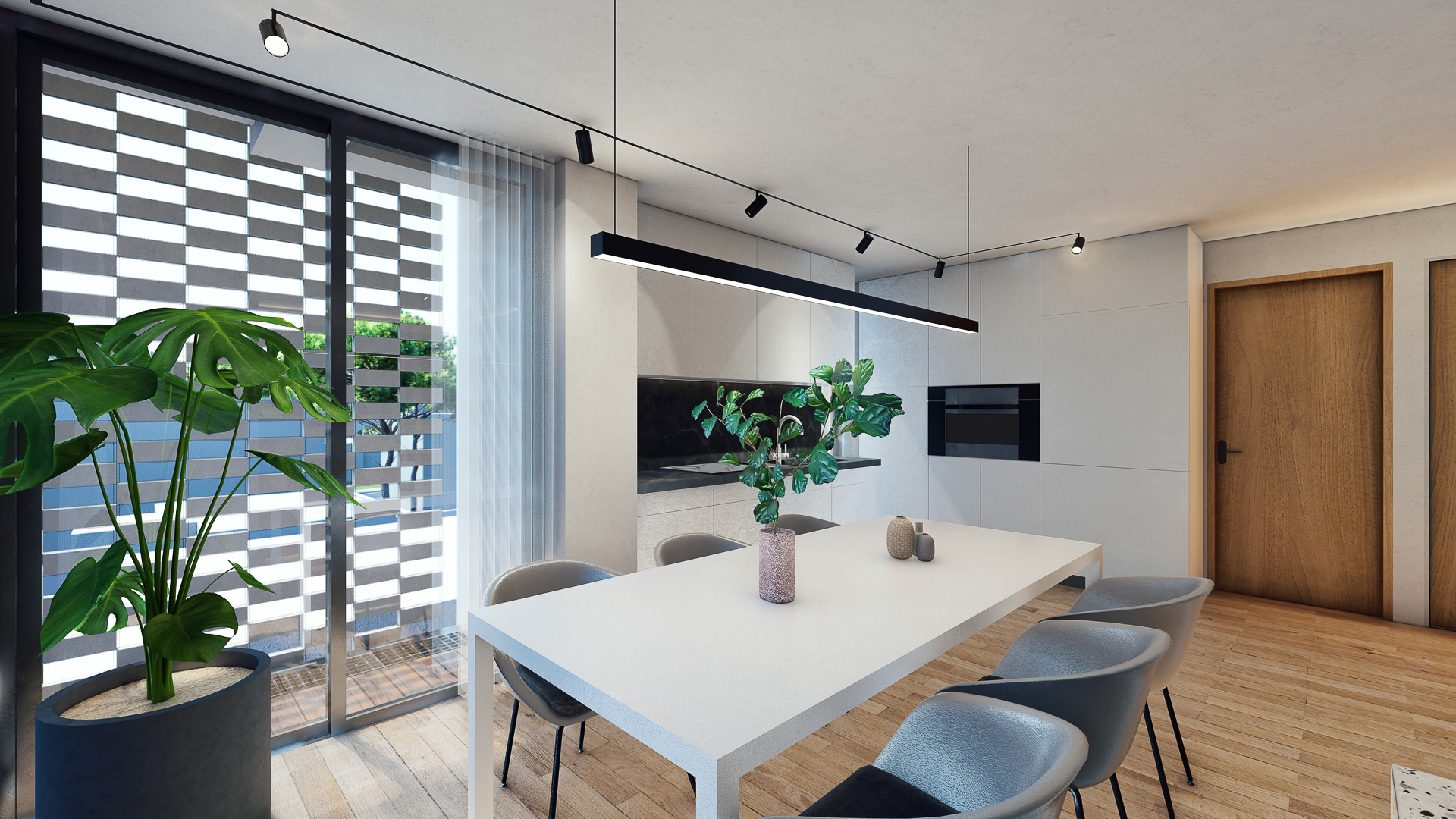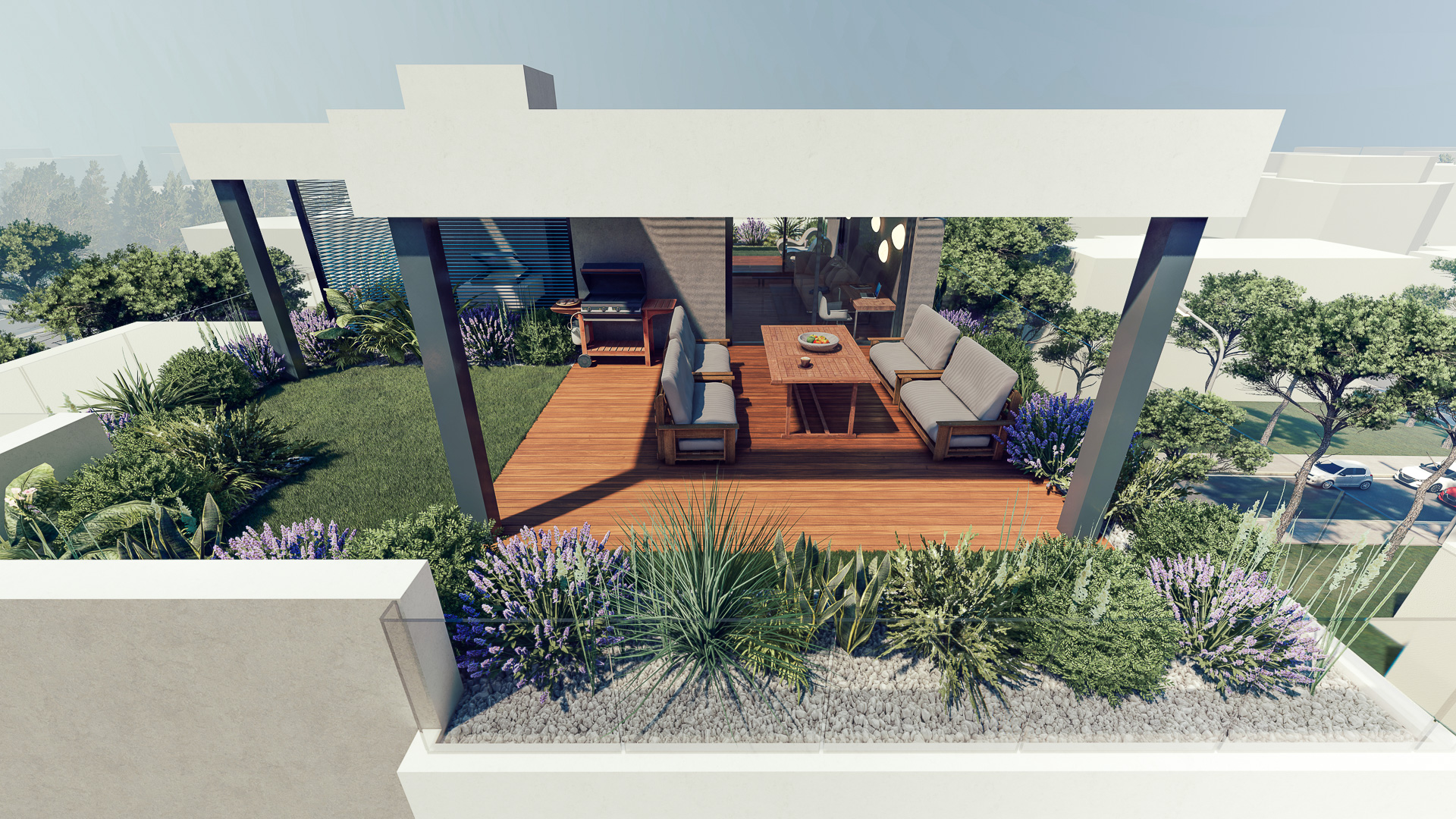 For this effect to be achieved, all the common areas on the fourthfloor level are placed on the side facing the street ensuring sea view. The residence includes a large master bedroom, two additional bedrooms with bathroom, while on the fifth-floor level there is an additional room, with bathroom & guest dressing room, providing access to the garden on the top floor.
